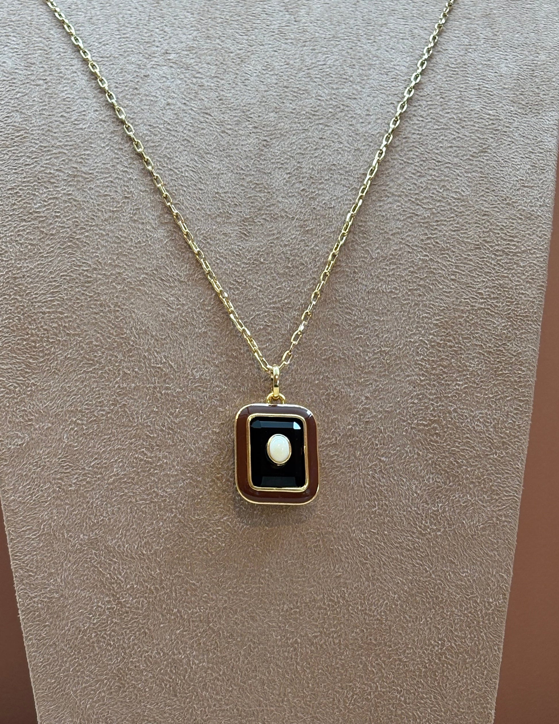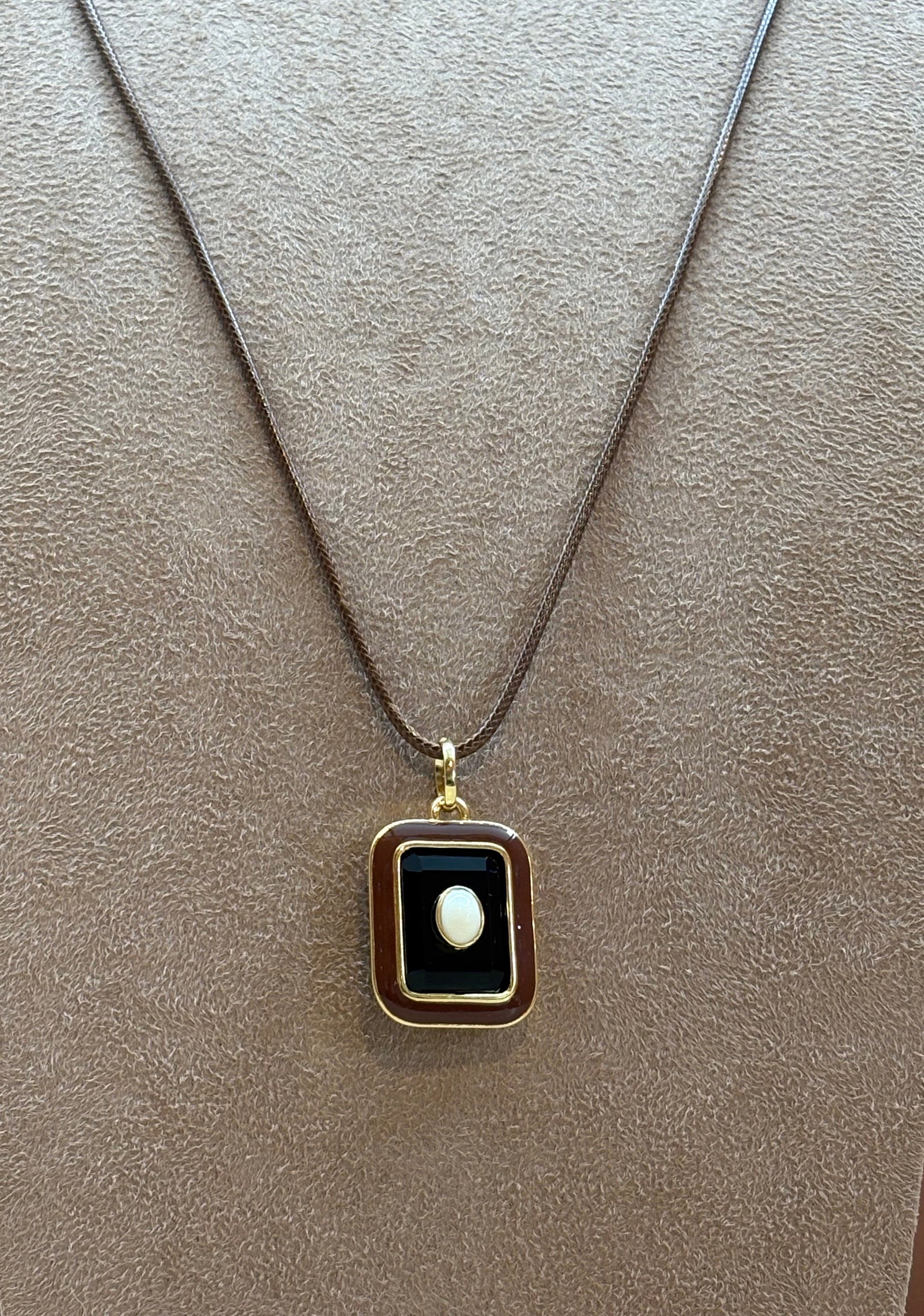 Colar Longo Corrente/Couro Marrrom Pingente Quadrado Resina